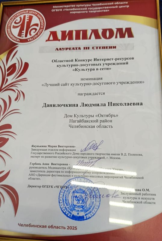 Областной конкурс интернет-ресурсов культурно-досуговых учреждений «Культура в сети» .23 сентября 2025 года, на V областном съезде руководителей КДУ в селе Долгодеревенское состоялась церемония награждения победителей конкурса. Дом культуры «Октябрь» п. Южный стал лауреатом 3 степени в номинации «Лучший сайт культурно-досугового учреждения».